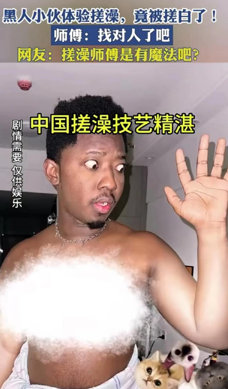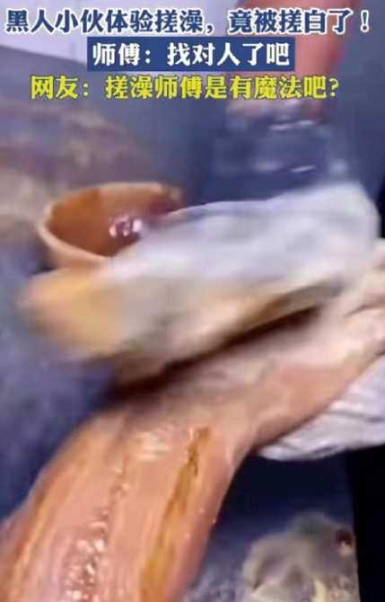 黑人网红来中国体验搓澡,调侃如果从小搓澡,自己会变成白人,最近,一段外国网红在中国体验“搓澡”的视频在社交平台上引发了不少讨论,视频的主角是一位来自海外的黑人博主,他在朋友的推荐下来到中国澡堂体验传统搓澡服务,结果过程和效果都让他大吃一惊,甚至在镜头前连连感叹,直呼自己的世界观都被刷新了。
