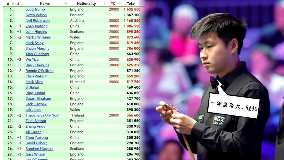 在此排名格局下,塔猜亚的强劲势头不容忽视。他与丁俊晖的积分差距已缩小至68250分。这意味着,一旦塔猜亚能够在接下来的巡回锦标赛中再度捧杯,便将实现对丁俊晖排名的超越,直接威胁到后者宝贵的世锦赛种子席位。