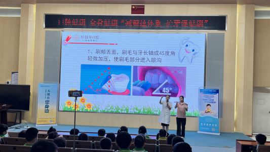 活动现场,医师借助PPT课件和动画短片,用通俗易懂的语言向学生们讲解牙齿的结构与功能,并深入浅出地介绍龋齿、牙周病等常见口腔疾病的成因及其对身体健康的潜在影响。针对儿童青少年日常饮食习惯特点,讲座特别强调“减糖”在预防蛀牙中的关键作用。医师向同学们同步科普均衡膳食对牙齿健康的重要性,指导大家减少含糖饮料和高糖零食的摄入,多吃富含纤维的蔬菜水果。同时,现场还进行了正确的刷牙方法示范,重点讲解了巴氏刷牙法的操作要点,并反复强调“早晚刷牙、饭后漱口”这一基础但至关重要的护牙习惯。此次宣讲注重互动性与实践性,将专业知识融入轻松活泼的形式之中,让学生们在观看、聆听与参与中掌握实用的口腔保健知识,增强自我健康管理意识。